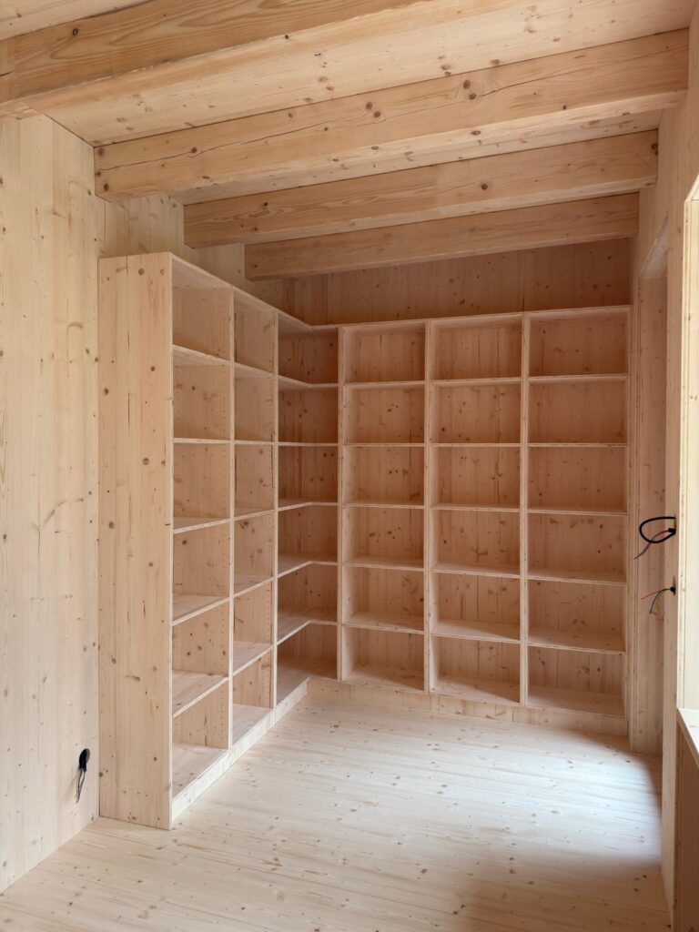 Fabrication et pose du mobilier, rangements et éclairage LED intégrés.