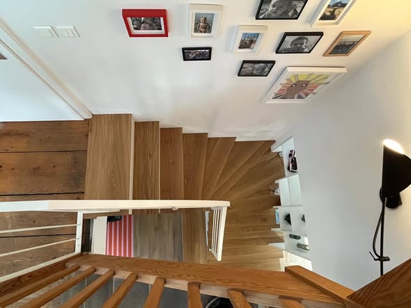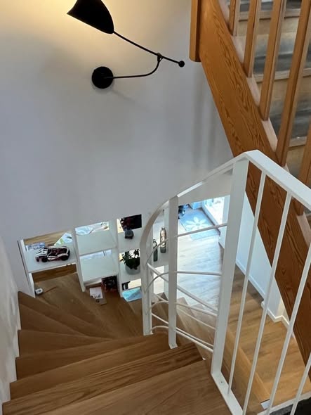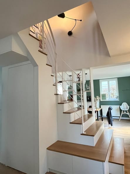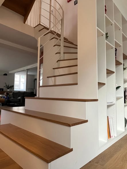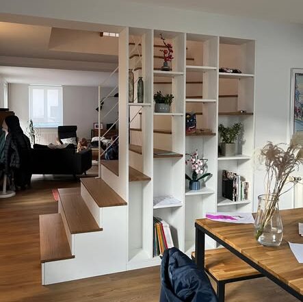 À Strasbourg, nous avons conçu et installé un escalier sur mesure en bois massif et mélaminé, intégrant rangements ouverts et fermés ainsi qu’un garde-corps.